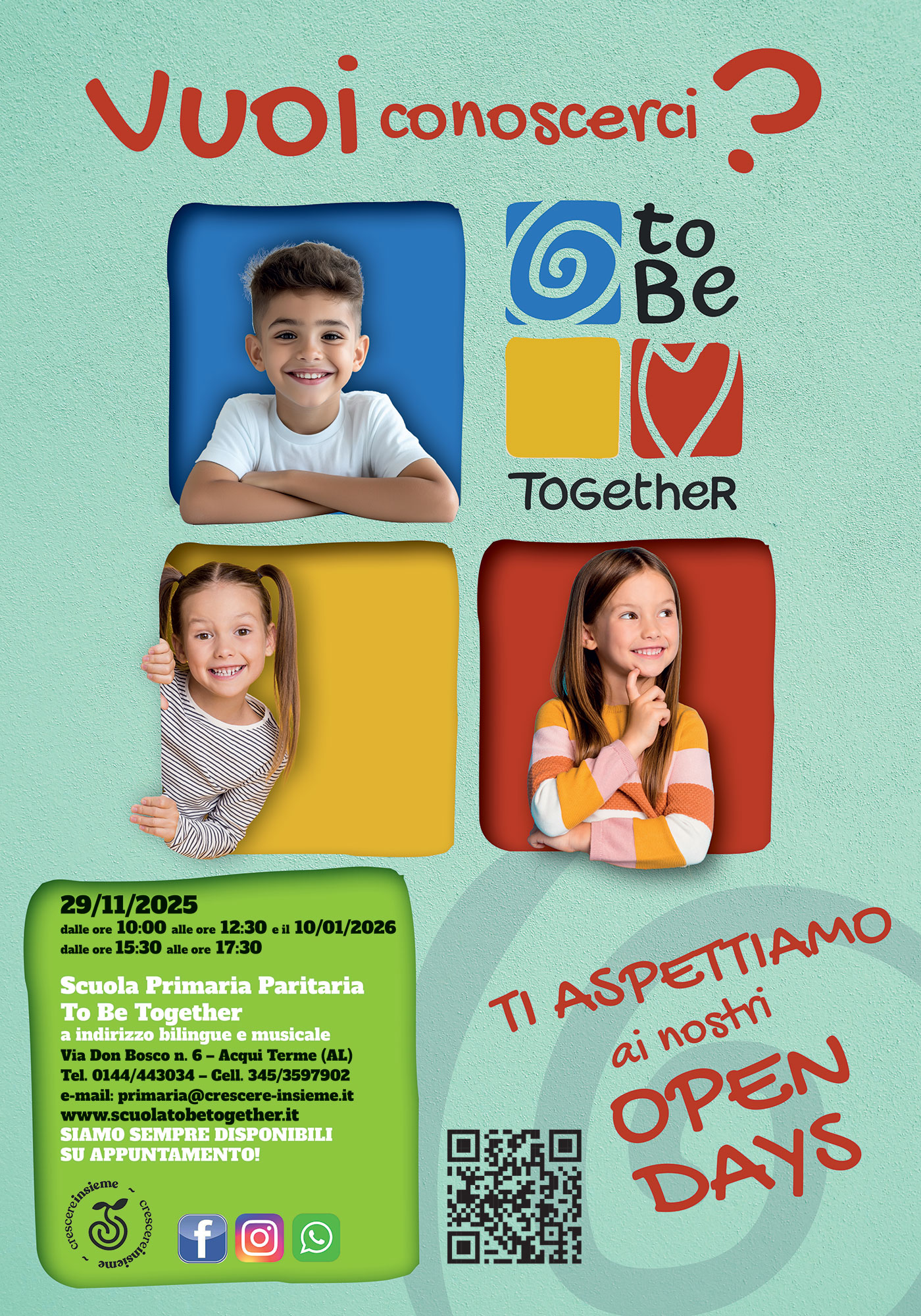 La scuola primaria paritaria To Be Together, è stata presa in gestione dalla Cooperativa CrescereInsieme, in seguito alla chiusura dell’Istituto Santo Spirito, gestito dalle suore Salesiane fino a giugno 2020 ed è il frutto della sinergia tra diverse persone ed enti, che hanno operato per il bene dei bambini e, in generale, della città di Acqui Terme dove continua ad essere un riferimento educativo e culturale importante. In un ambiente tranquillo e sereno, che promuove il dialogo e la collaborazione con le famiglie, gli allievi imparano, sono seguiti nella crescita personale e sono incoraggiati a dare il meglio di sé, nel riconoscimento dei propri talenti e dei propri limiti, nel rispetto degli altri affinché diventino “onesti cittadini, cristiani convinti” (Don Bosco).